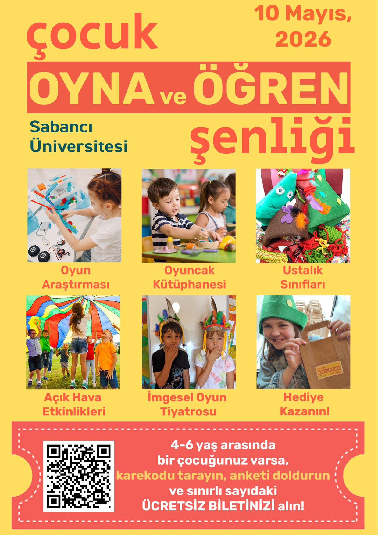 Çocuklar için eğlence ve öğrenmenin bir araya geldiği ikinci eğitim ve eğlence festivalimizde buluşuyoruz! Psikoloji alanında bir araştırma projesi (TÜBİTAK tarafından desteklenen ve gerekli tüm etik onaylara sahip olan) kapsamında, 10 Mayıs 2026 tarihinde Sabancı Üniversitesi'nde “Oyna ve Öğren” Festivali düzenliyoruz. 4-6 yaş arası çocuklara yönelik tasarlanan festival, oyun araştırması, eğitici bilim ve sanat oyunları, eğlenceli dış mekân oyunları gibi birçok eğlenceli etkinliği içermektedir. Çocukları ve ailelerini festivalimize katılmaya davet ediyoruz! Detaylı bilgi için lütfen broşürümüzü ve https://www.imageryplay.space/festival-2026-tr web sitemizi inceleyin.