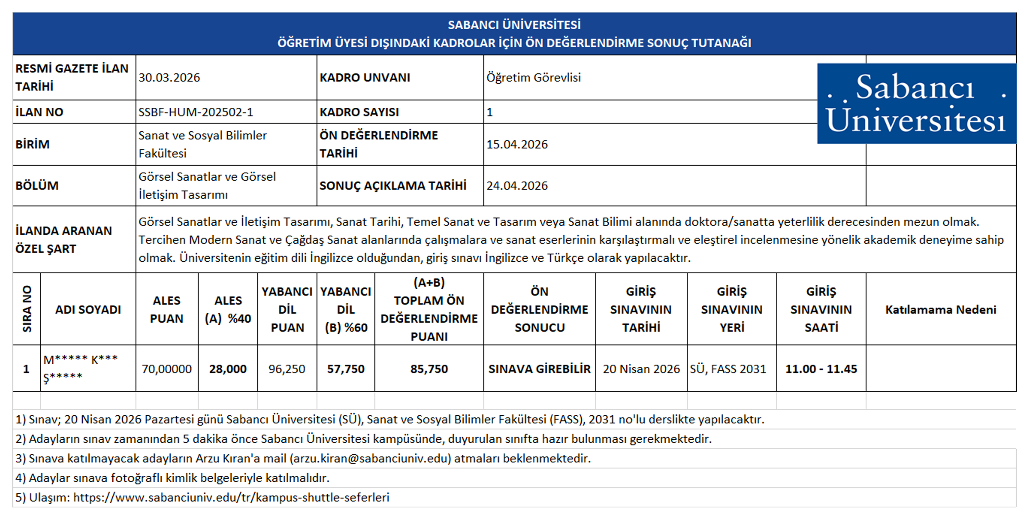 Resmi Gazete İlanı: Öğretim Görevlisi (SSBF-HUM-202502-1)